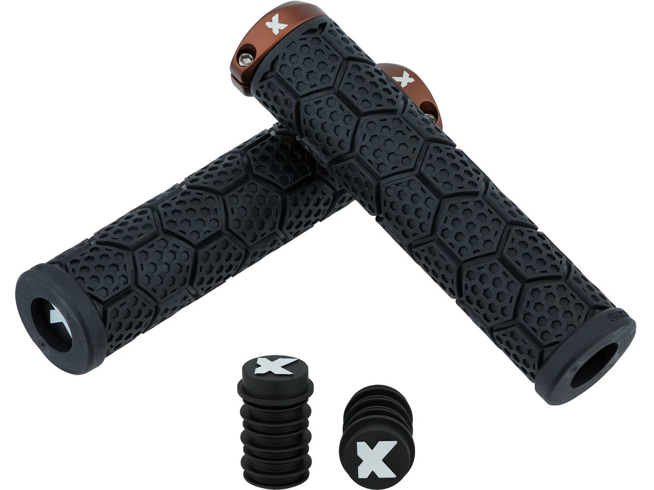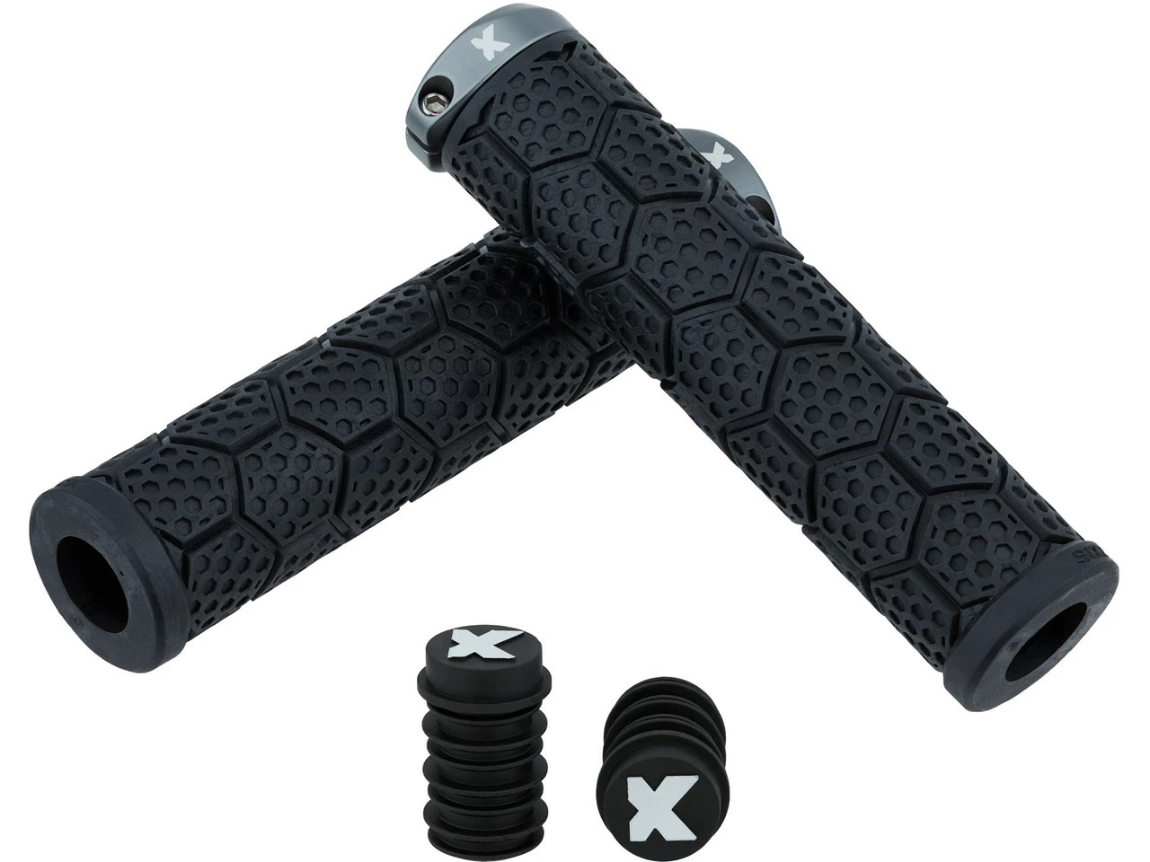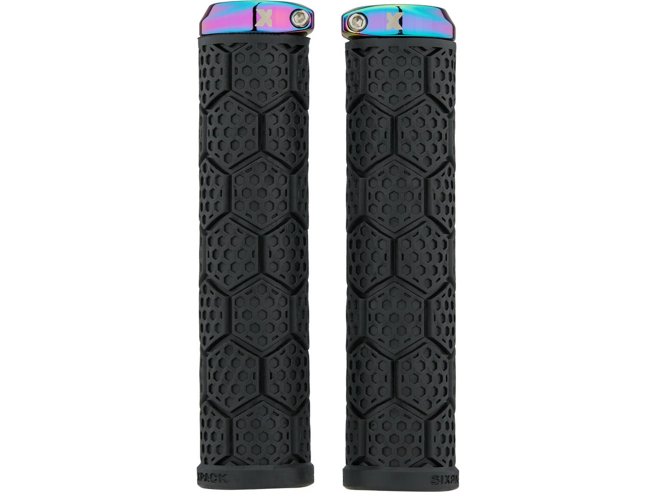 Die dickeren D-Trix AL Lenkergriffe von Sixpack Racing mit Aluminium-Klemmring und Wabendesign